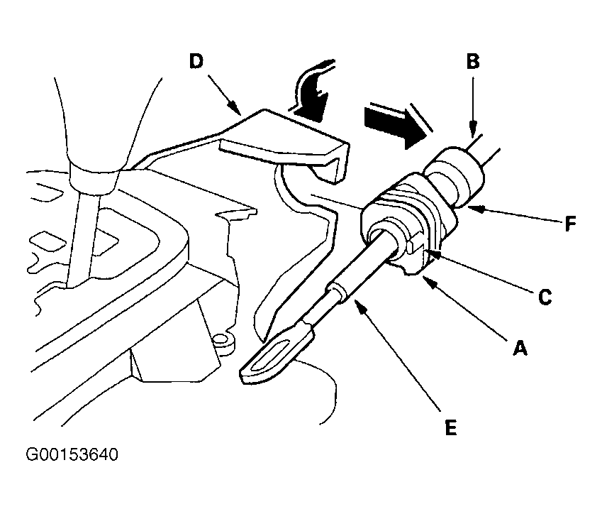 - Rotate the socket holder (A) on the shift cable (B) a quarter turn; the tab (C) on the socket holder will be in the opening of the gearshift lever bracket base (D). See Fig 2. Then slide the holder to remove the shift cable from the gearshift lever bracket base (D). Do not remove the shift cable by twisting the shift cable guide (E) and damper (F).