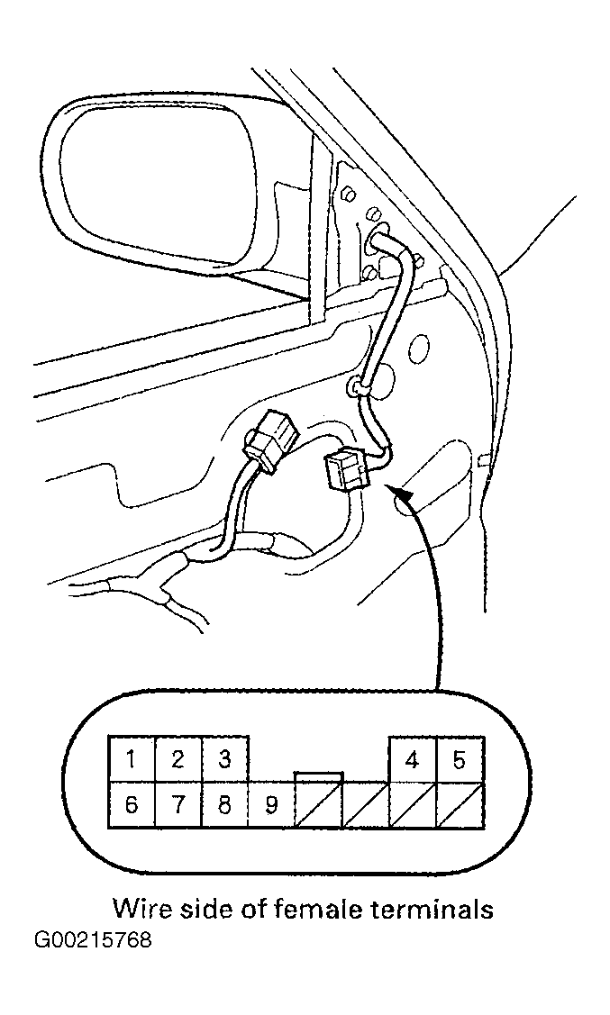 Remove appropriate door panel. See DOOR PANEL under REMOVAL & INSTALLATION. Disconnect power mirror harness connector. See Figure . Using DVOM, check for continuity between mirror connector terminals No. 4 and 5. If continuity does not exist, replace power mirror defogger.