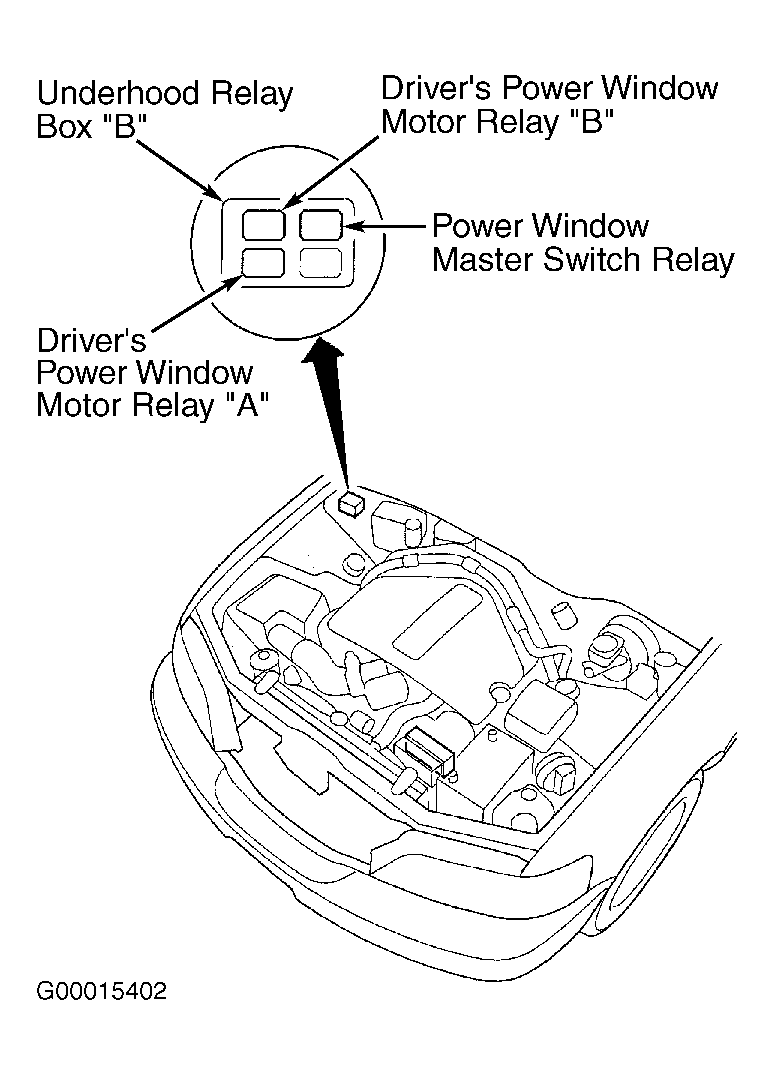 Check for malfunctioning pulser integrated in to driver's power window motor. See DRIVER'S POWER WINDOW MOTOR  under COMPONENT TESTS. Check for malfunctioning driver's power window relay "A" or "B" in underdash fuse/relay box. See Figure . See RELAYS  under COMPONENT TESTS. Check for proper multiplex control unit input. See 3.5RL  under MULTIPLEX CONTROL UNIT under SYSTEM TESTS. Also check for open circuit in Blue wire between door multiplex control unit and driver's power window motor. See WIRING DIAGRAMS  .