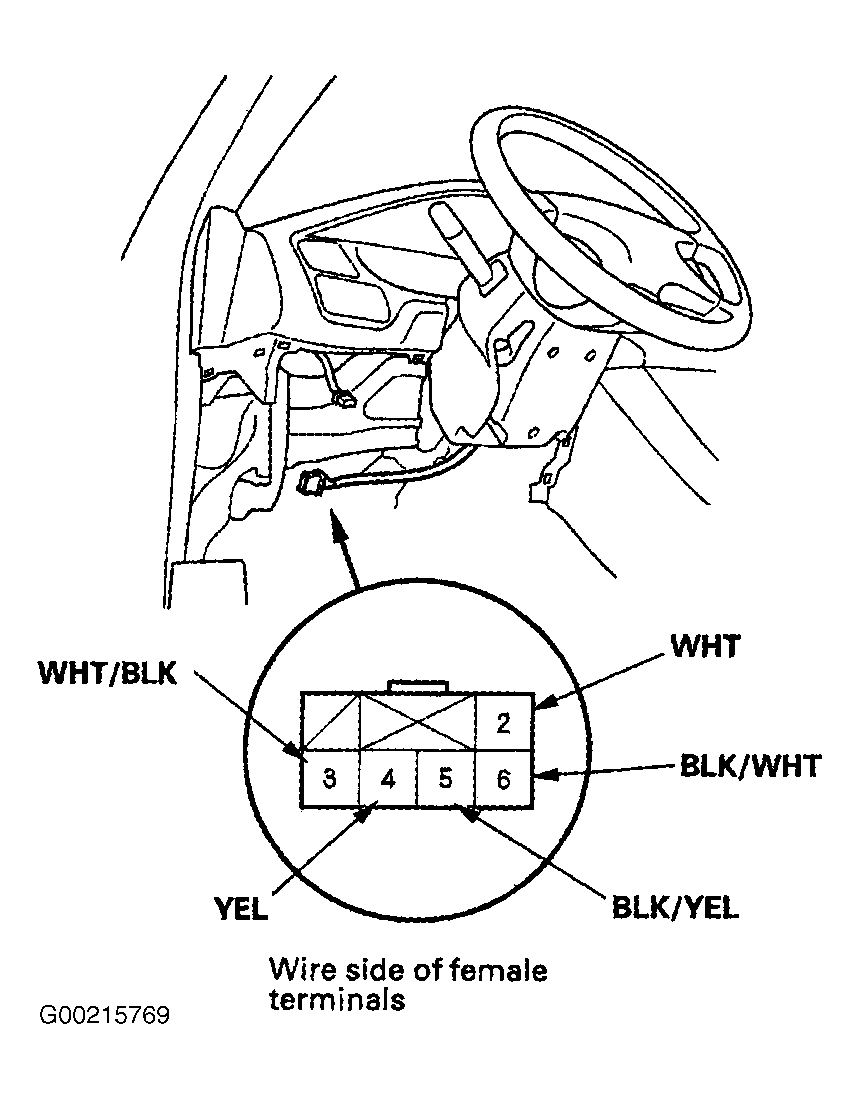 Disconnect negative battery cable. Remove dashboard lower cover. Disconnect 6-pin connector from driver's under-dash fuse/relay box. See Fig 1. Check for continuity between terminals in each switch position. See IGNITION SWITCH CONTINUITY table. If continuity is not as specified, replace ignition switch.