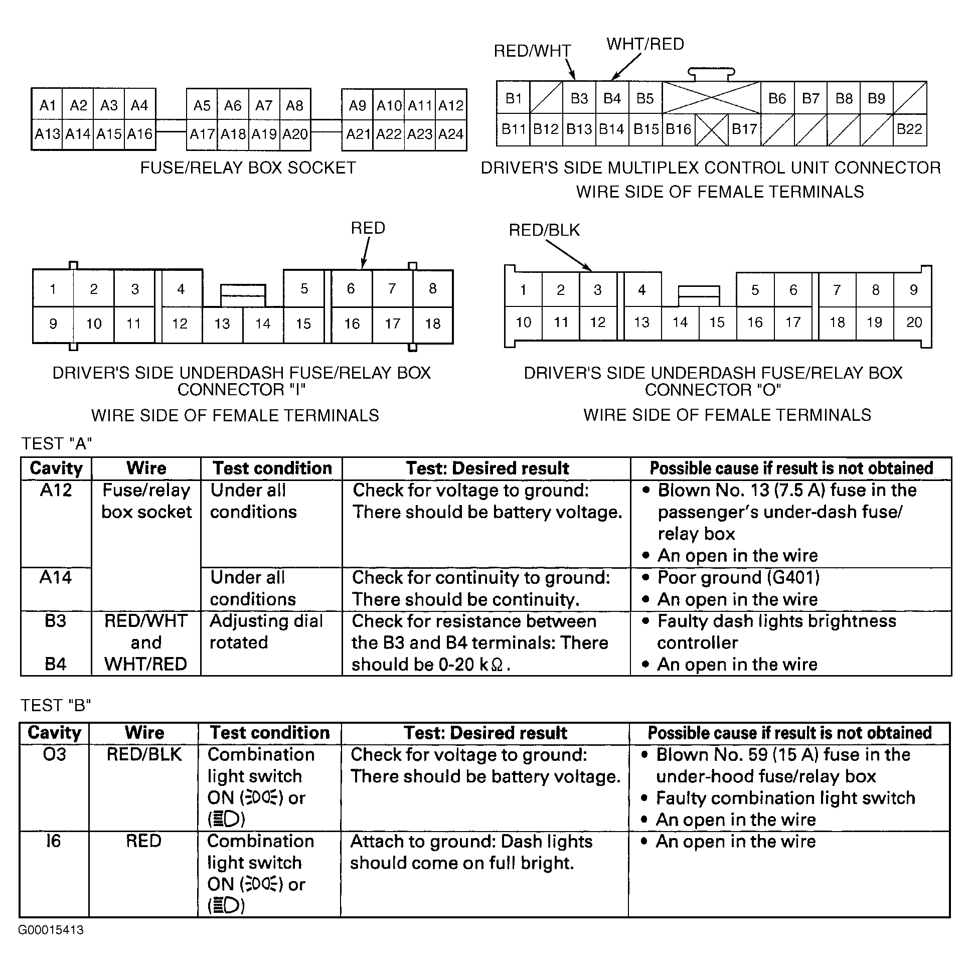 - Reconnect driver's multiplex control unit to underdash fuse/relay box. Perform input test "B" as specified at back side of driver's fuse/relay box (backprobe). See Fig 2. Repair as necessary.