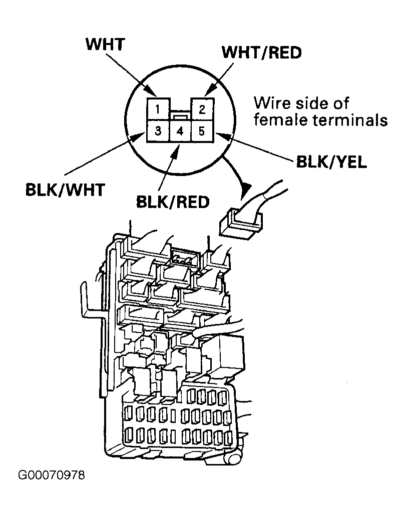 Disable air bag system. See appropriate AIR BAG RESTRAINT SYSTEMS article. Remove instrument panel lower cover. Disconnect ignition switch 5-pin harness connector, located in underdash fuse/relay box. Using DVOM, check for continuity between specified terminals in each switch position. See IGNITION SWITCH CONTINUITY (RSX) table. See Fig 1 . If continuity is not as specified, replace ignition switch. See appropriate STEERING COLUMN & SWITCHES article in ACCESSORIES & EQUIPMNET.