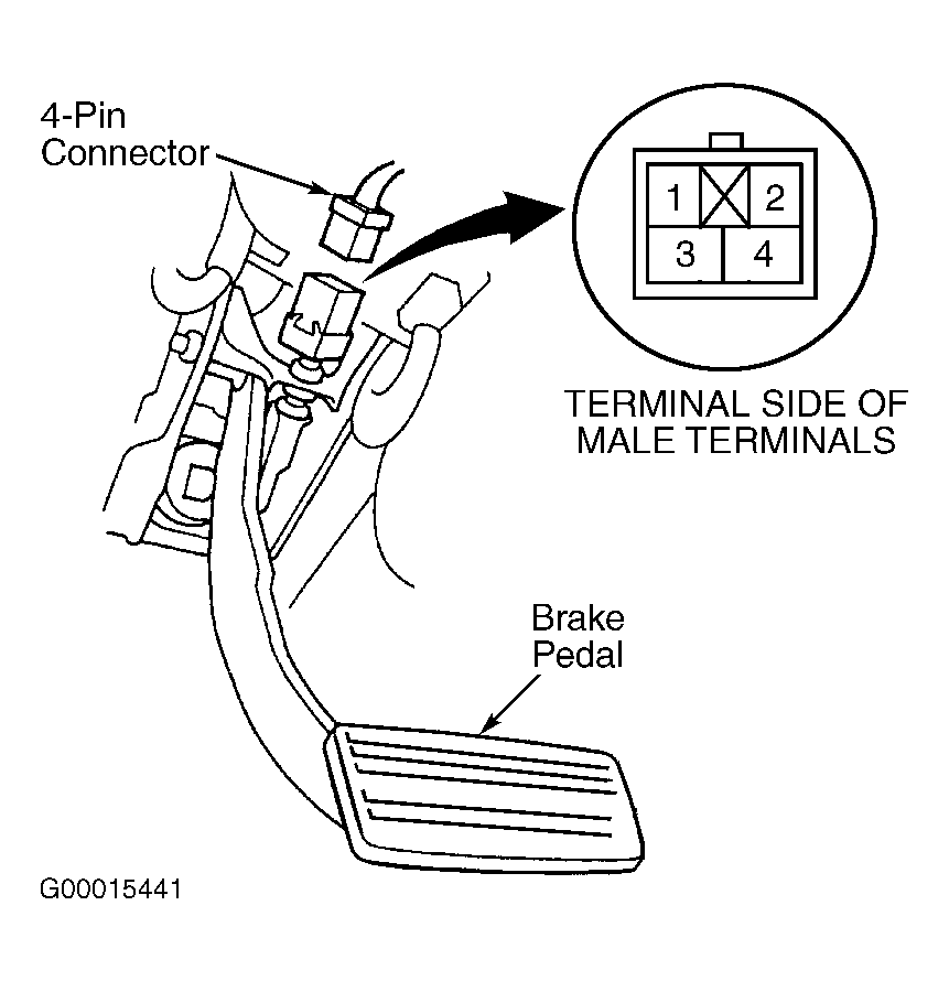 Disconnect brake switch 4-pin connector. With brake pedal depressed, continuity should exist between brake switch terminals No. 1 and 2. See Fig 1 . With brake pedal released, continuity should exist between brake switch terminals No. 3 and 4. If continuity is not as specified, adjust brake pedal height and recheck brake switch operation. See DISC - MDX, 3.2CL, 3.2TL & 3.5RL article in BRAKES. If brake pedal height is okay, replace brake switch.