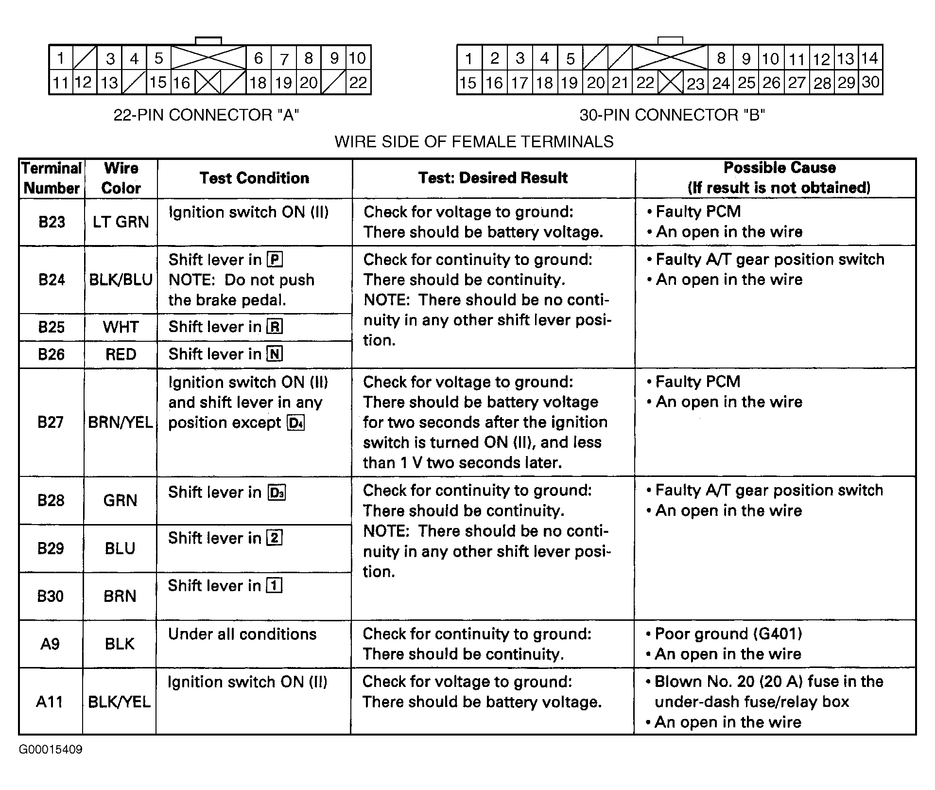 Remove instrument cluster. See INSTRUMENT CLUSTER under REMOVAL & INSTALLATION. Disconnect instrument cluster 22-pin connector "A" and 30-pin connector "B". Inspect connectors and terminals. Check for bent, loose or corroded terminals. Perform gearshift lever position indicator input test. See Fig 1 . Repair as necessary and recheck system operation. If gearshift lever position indicator inputs are okay, replace instrument cluster printed circuit board and recheck system.