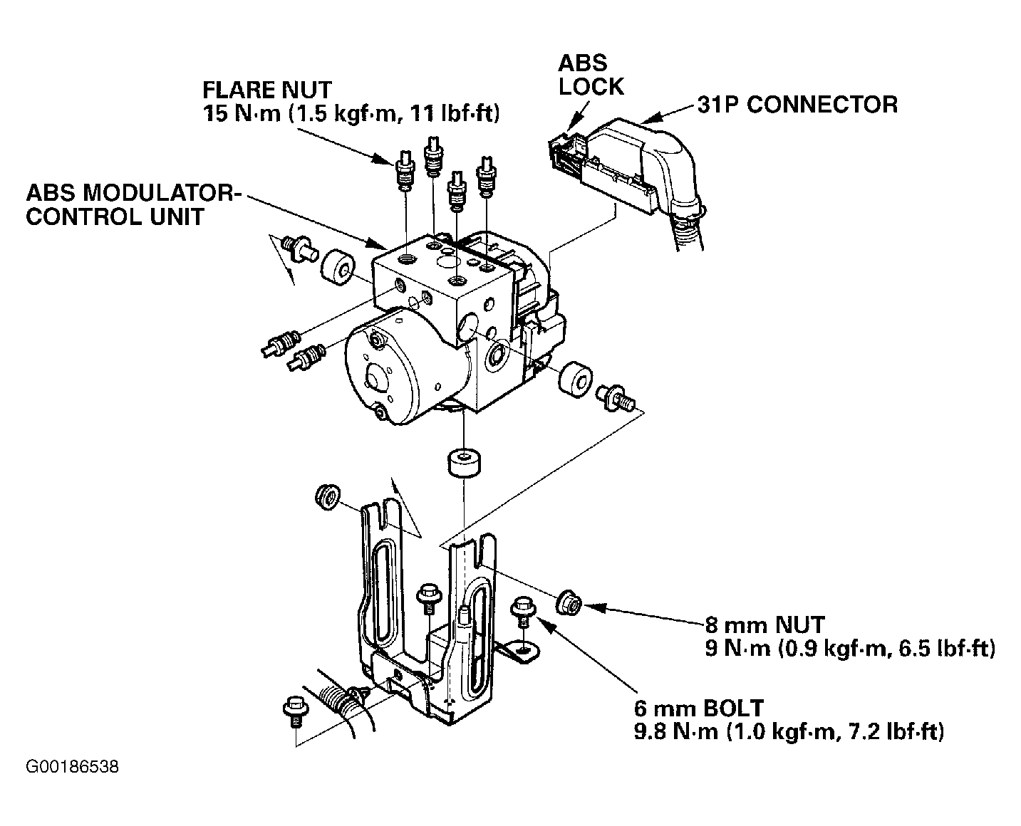 Pull up on the lock of the ABS control unit 31P connector, then disconnect the connector. Disconnect the 6 brake lines. Remove the two 8 mm nuts. Remove the ABS modulator-control unit. See Fig 1 .
