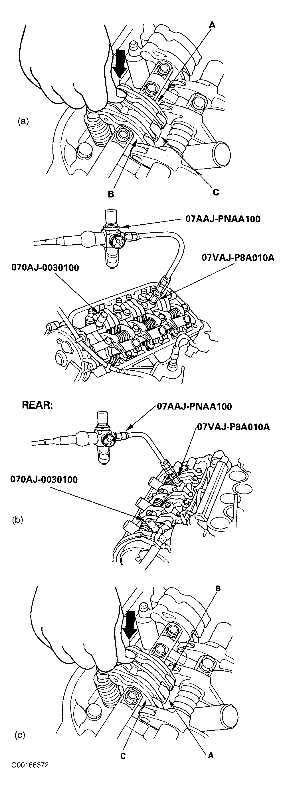 - Ensure the intake primary rocker arm (A) and intake secondary rocker arm (B) are mechanically connected to piston and mid rocker arm (C) does not move when pushed manually. See (c) in Fig 1 . If any intake mid rocker arm (C) move independently of the primary rocker arm (A) and secondary rocker arm (B), replace rocker arms as a set.