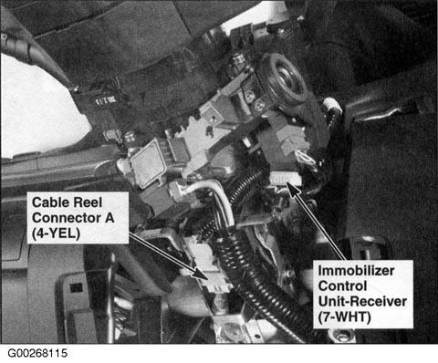 | Immobilizer Control Unit-Receiver | Under steering column cover. See Figure. |