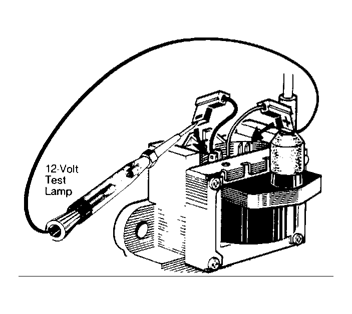 - Be sure all connectors are attached to computer. Disconnect harness connectors from coil primary terminals. Install 12-volt test lamp between 2 connectors just removed. See Fig 1.