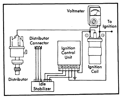 - Remove connector from distributor. Connect positive lead of voltmeter to terminal 15 of ignition coil. Connect negative lead to terminal 1 of coil. See Fig 1. Turn ignition switch "ON".
