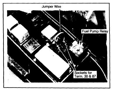 - To operate fuel pump with engine not running, disconnect fuel pump relay from relay panel (VW, Porsche, Audi, Saab, Mercedes-Benz). Insert a jumper wire into sockets that correspond to terminals 30 and 87 on relay. See Fig 2.