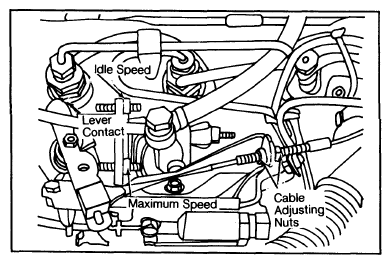 Place accelerator pedal in full throttle position. Adjust cable with adjusting nuts until pump lever freely contacts stop. See Fig 1. Be sure ball pin on pump lever is pointing upward and touching end of elongated hole. Accelerator cable should be attached at upper hole in bracket.