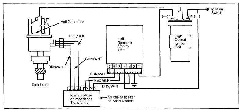 The Bosch Hall Effect electronic ignition system consists of a breakerless Hall Effect distributor, a Hall (ignition) control unit, ignition coil, ignition switch, and battery.
