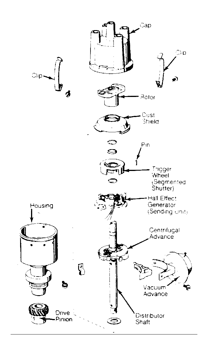 The Hall Effect distributor has conventional centrifugal and vacuum advance mechanisms. See Figure.