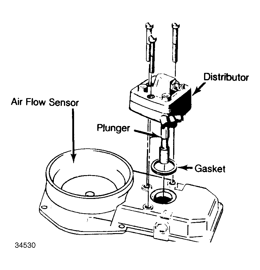 - Remove 3 screws from fuel distributor and lift off of air flow sensor housing. DO NOT to drop control plunger. See Fig 2 .