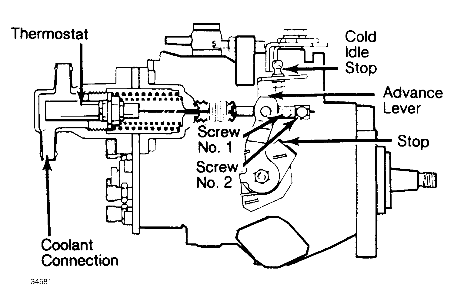 5. If necessary, loosen bolts on mounting plate and support. Turn pump to adjust timing and tighten bolts. Recheck dial indicator readings. Turn clamp on cold start device back 90° to original position and tighten screw No. 1.
