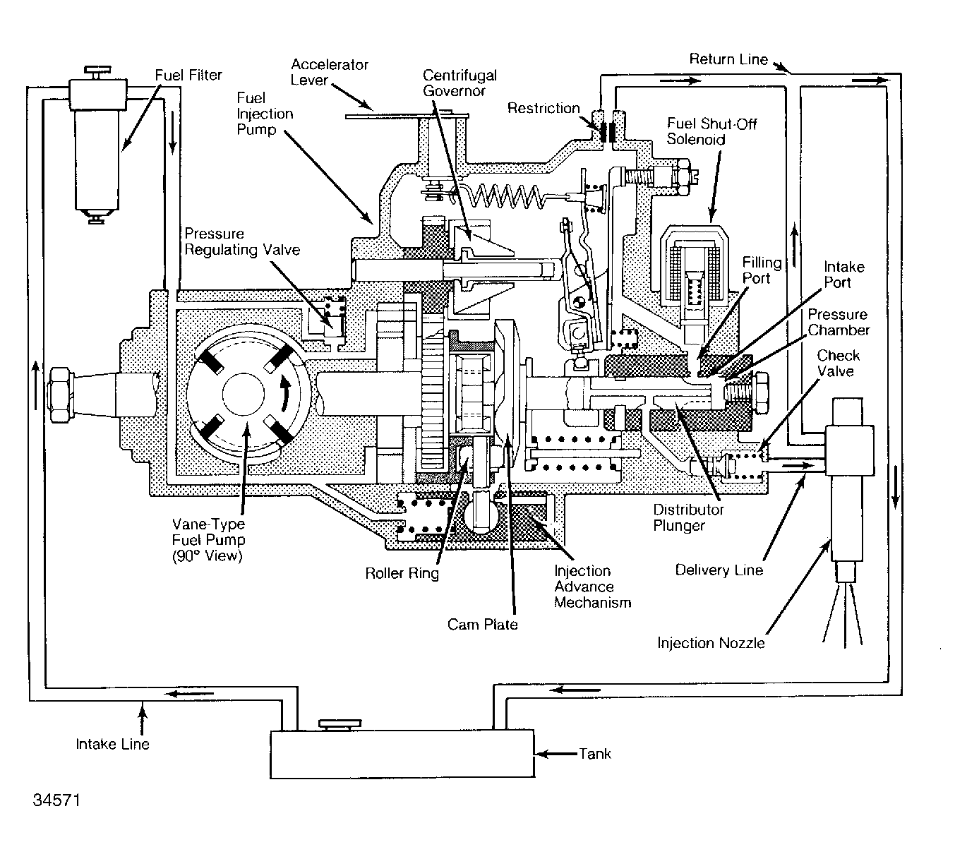 The Bosch single plunger mechanical pump consists of a low-pressure, vane-type fuel pump, a high-pressure distributor plunger injection pump, a centrifugal governor, an injection timing mechanism, an electrical fuel shut-off solenoid, and a manual injection pump shut-off valve. See Fig 1 .
