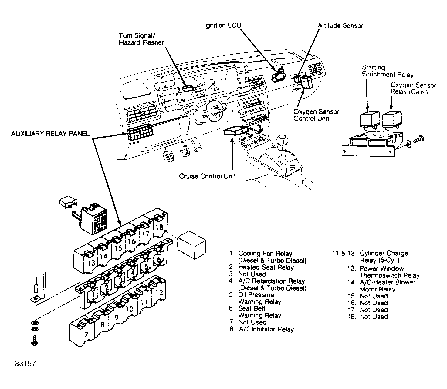 | Oxygen Sensor Control Unit | Under instrument panel, right side of glove compartment. See Figure. |