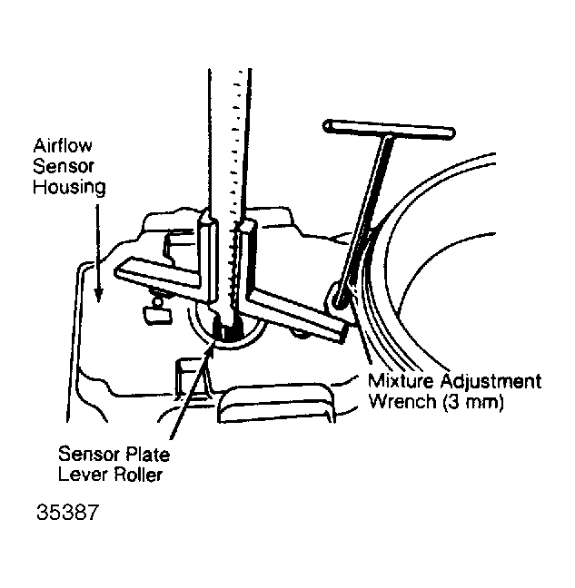 - Check basic adjustment of sensor plate lever. With fuel distributor removed from airflow sensor housing, measure distance between roller on sensor plate lever and contact points of fuel distributor on top of airflow sensor housing.
