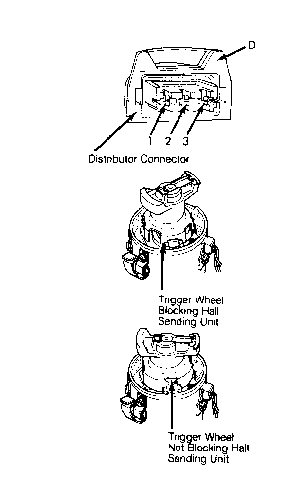 The Hall Effect sending unit in the distributor receives voltage from the knock control unit or directly from the electronic ignition control unit. A trigger wheel (shutter blades) mounted on the distributor shaft passes in and out of the air gap of the Hall Effect sending unit, resulting in signal pulses. See Figure. There is one trigger wheel shutter/window for each engine cylinder (5000CS Quattro and 5000CS Turbo have only one window).