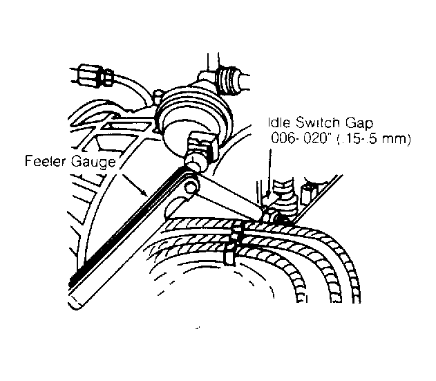 - Move throttle valve .20-.28" (.5-.7 mm). Measurement is made with feeler gauge between throttle valve stop and adjustment screw. Resistance should change from zero ohm (with throttle closed) to infinity as throttle gap increases beyond .020" (.5 mm).