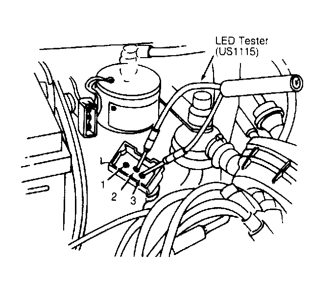 1. This check is necessary only if no ignition spark is present. Remove harness connector from output stage of ignition coil and connect LED Tester (US1115) to terminals 2 and 3. See Fig 1 .