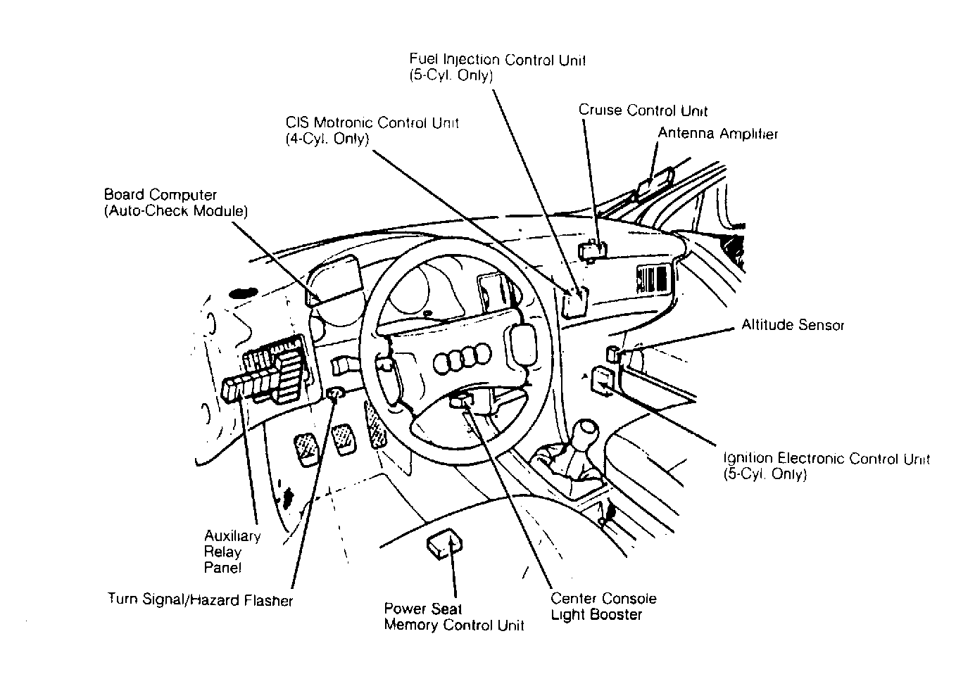 | Fuel Injection Control Unit (5-Cyl.) | Behind right side of dash, above glove box. See Figure . | |