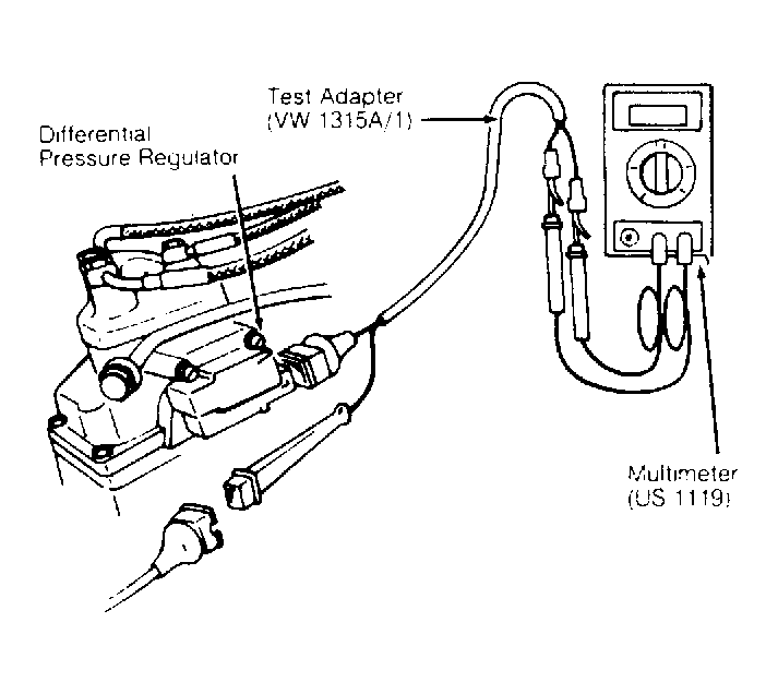 - Ensure engine is at normal operating temperature and no fault codes are stored in ECU memory. Using digital Multimeter (US 1119) and Adapter (VW 1315A/1), check voltage at differential pressure regulator.