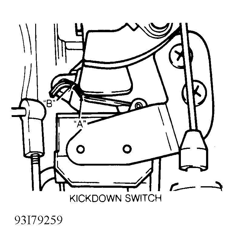 - Slowly depress accelerator pedal. Kickdown switch resistance should go to zero ohms (continuity) in range "A" and "B". See Fig 1 . If continuity does not occur, loosen kickdown switch mounting bolts and move throttle lever by hand to wide open throttle position. See Fig 2 and Fig 3 .