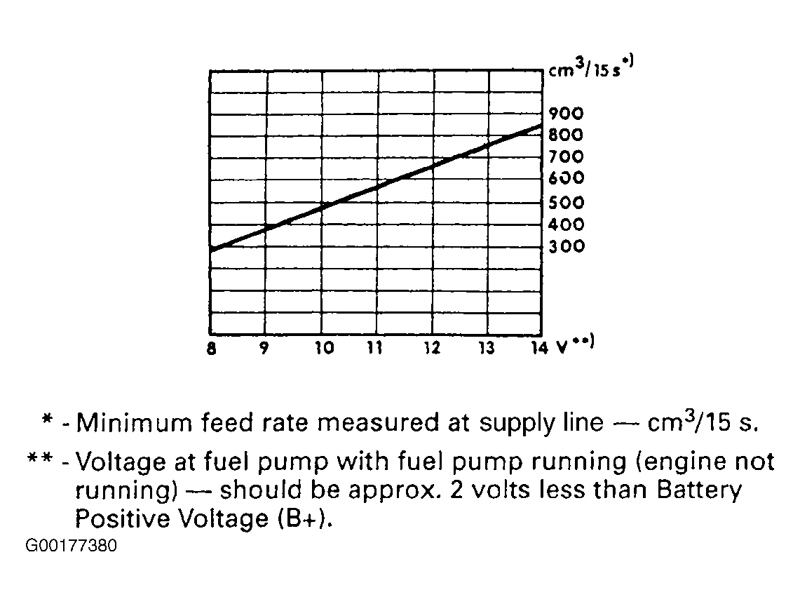 - Compare measured quantity with specified values for minimum feed rate in graph. See Fig 3 .Fuel delivery is dependent on battery voltage.