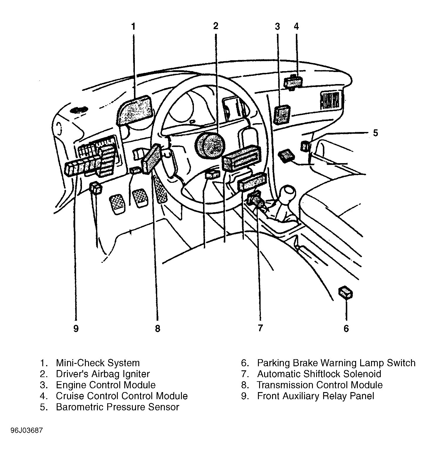 | Shift Lock Control Module | On front auxiliary relay panel, position No. 2. See Figure . |