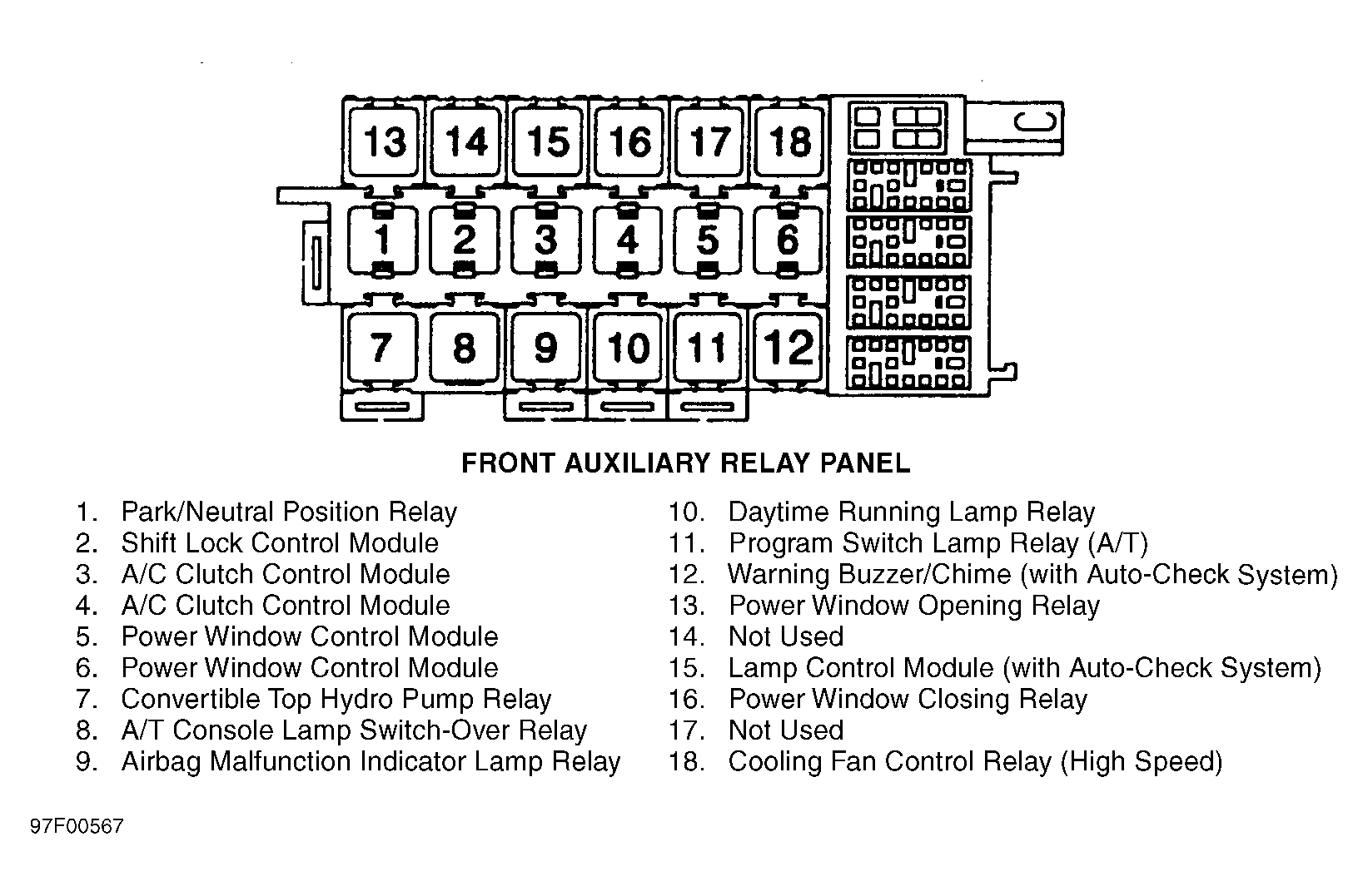 | Power Window Control Module | On front auxiliary relay panel, positions No. 5 & 6. See Figure . |