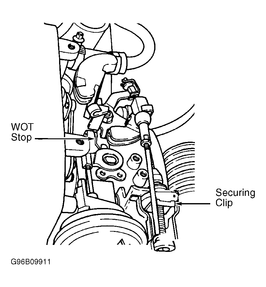 - Hold tight in this position. Insert securing clip for cable sleeve. See Fig 1 . Release accelerator pedal. After adjustment, ensure throttle opens to WOT position and closes until closed throttle stop is contacted. See Fig 2 .