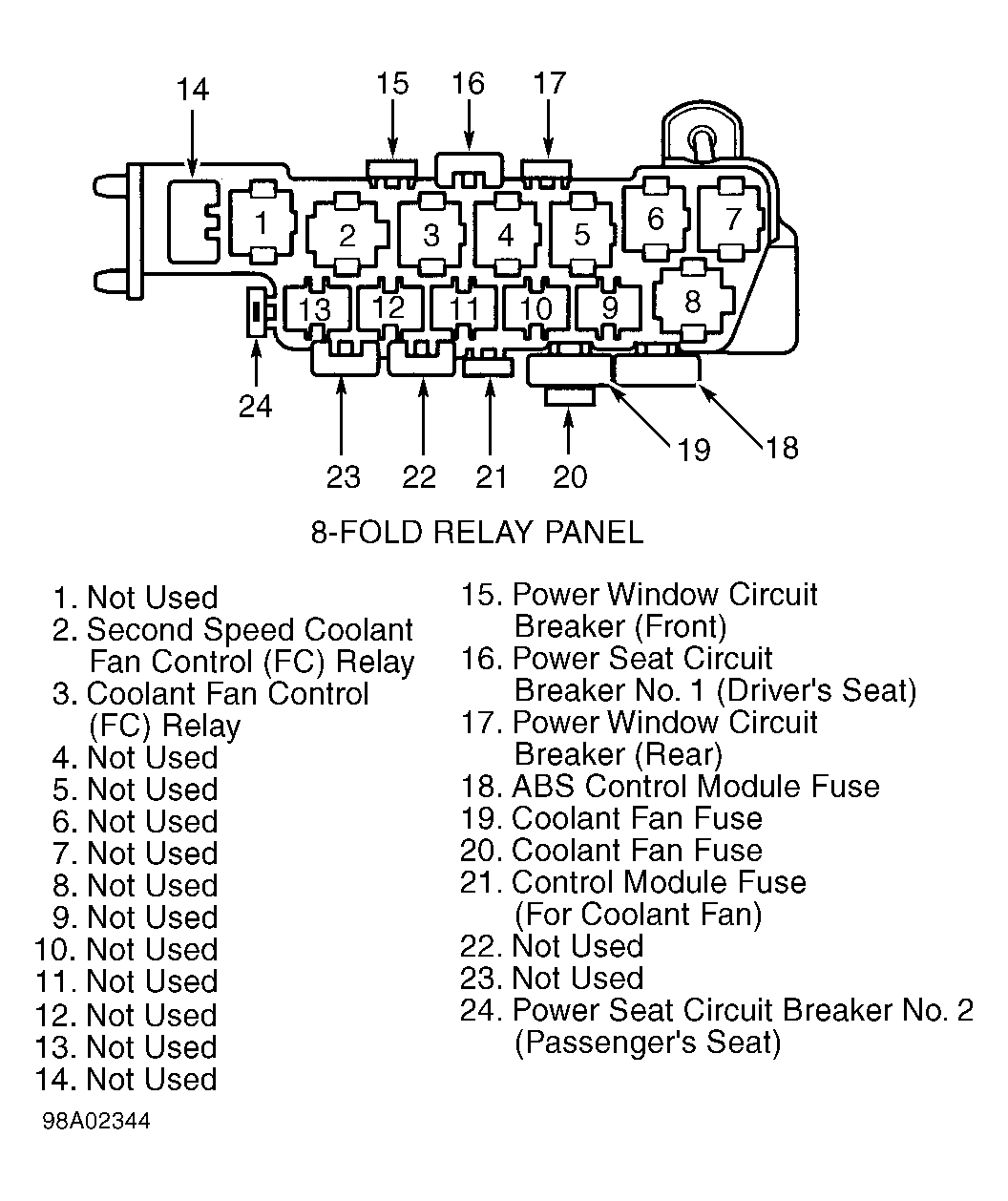 | Power Seat Circuit Breaker No. 2 (Passenger's Seat) | On 8-fold relay panel. See Figure. |