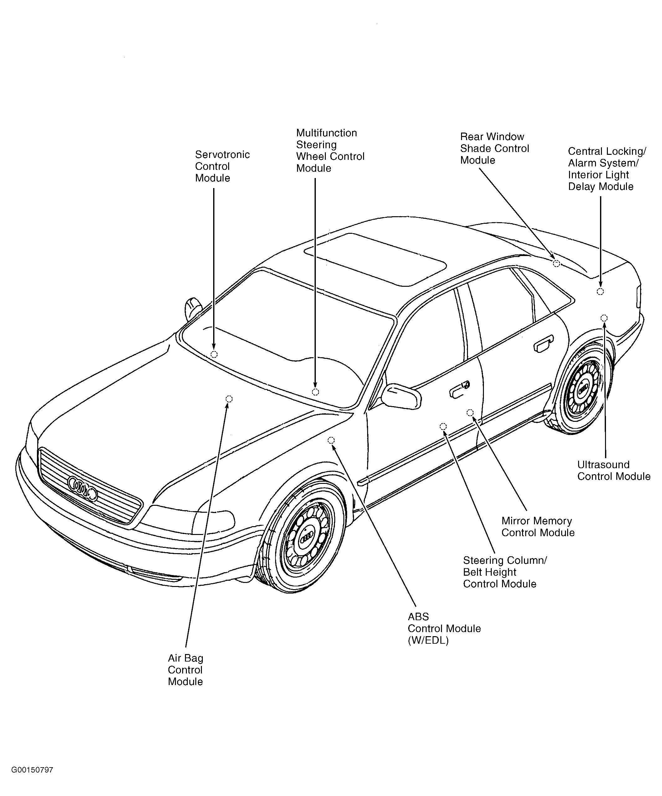 | Steering Column/Belt Height Control Module | Below left front seat. See Figure . |