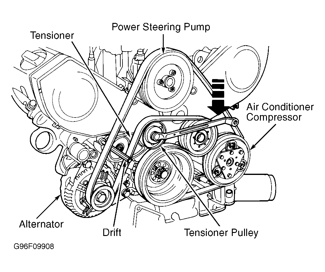 - Remove drive belt. Ensure belt has no splits, cracks or other damage. Replace drive belt if necessary. To install, reverse removal procedure. Install drive belt onto tensioning pulley last. Using a 17-mm wrench, hold tensioner and remove drift. Allow tensioner to move against drive belt. Install drive belt guard.
