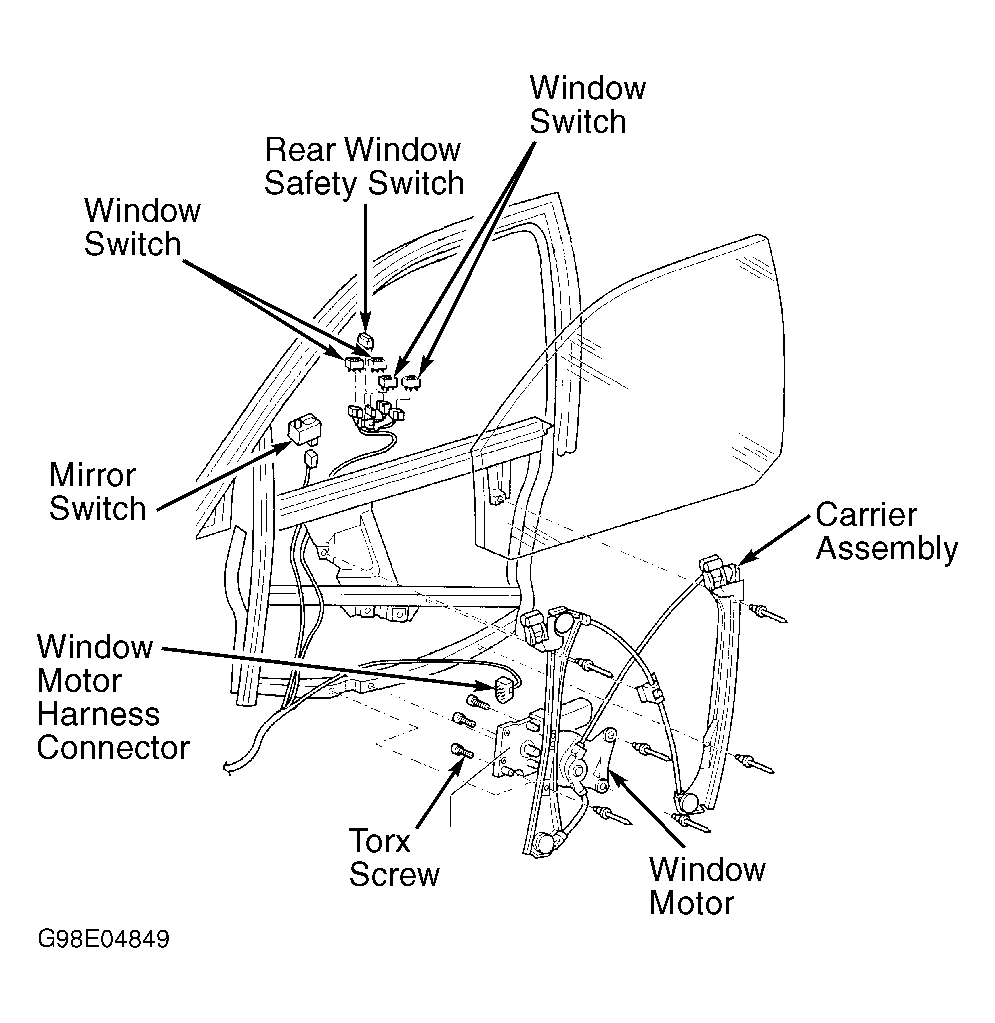 The power window system consists of control panel (located in driver's armrest) 3 remote operating switches, individual window motor/modules, wiring harness and connectors. Mechanical components include a regulator, carrier assembly and window hardware. See Fig 1 . Each power window has a separate control module that is integrated into each power window motor to control each window's functions separately.