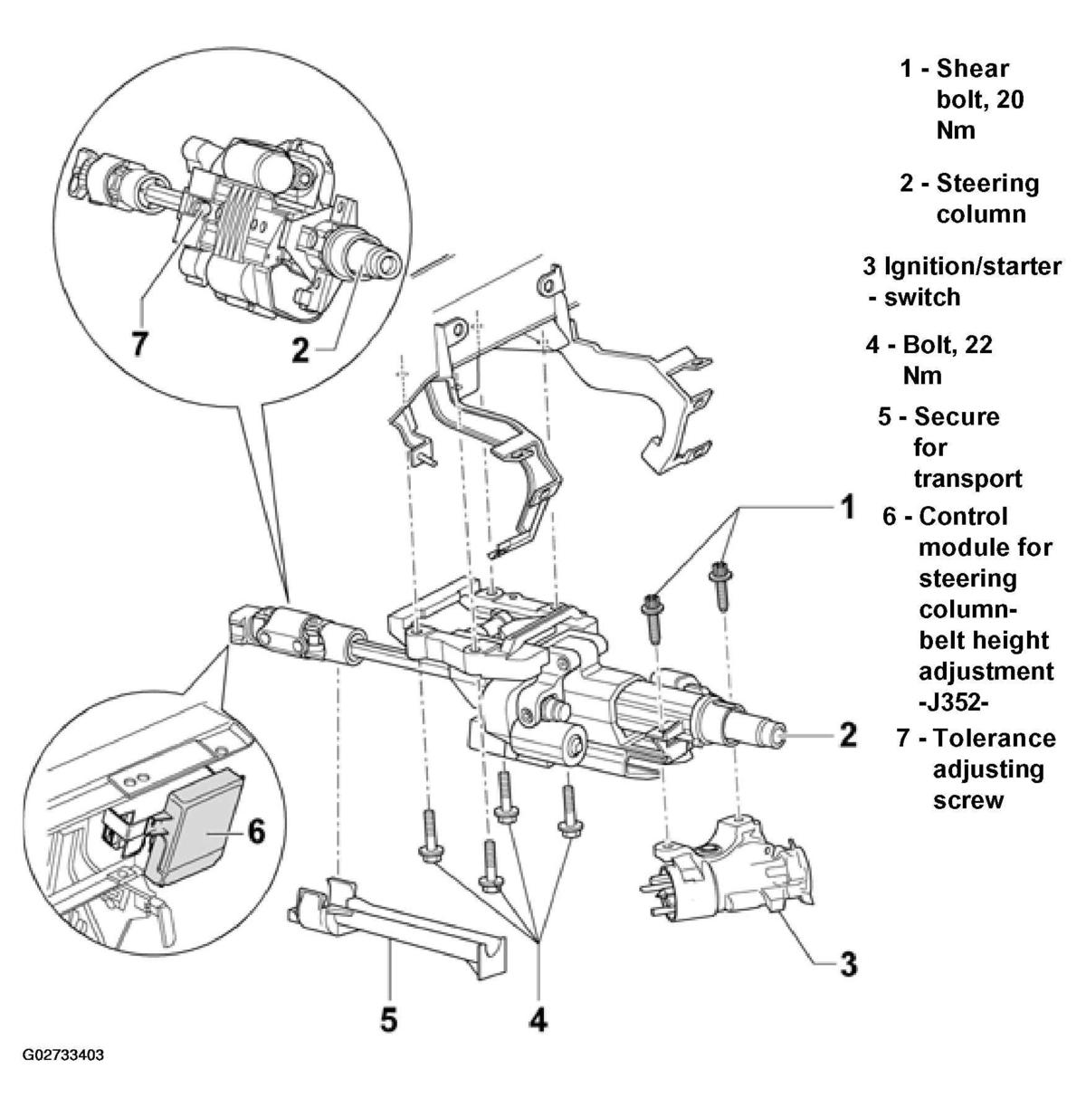 - All 4 bolts for attaching steering column to cross member must have been tightened to torque, before tightening tolerance adjusting screw