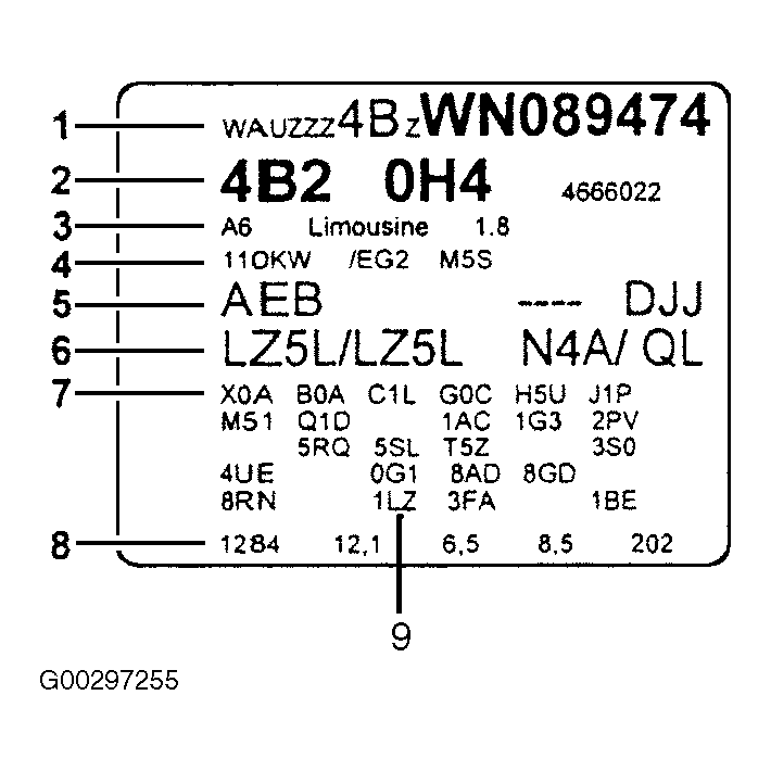 A6, Allroad, RS6 and S6 models are equipped with one of several brake systems. Brake caliper application is designated by the Production Code (Pr. No.). Pr. No. is printed on vehicle data sticker located in spare tire well or in owners customer's service schedule. See Fig 1. For brake caliper Pr. Nos., see PRODUCTION CODES table. To identify brake system and components, see Fig 2-Fig 7 .