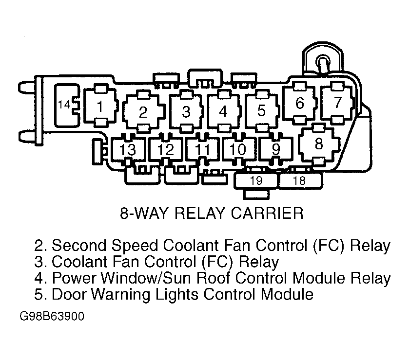 | Door Warning Lights Control Module | On 8-pin relay carrier, position 5. See Figure. |