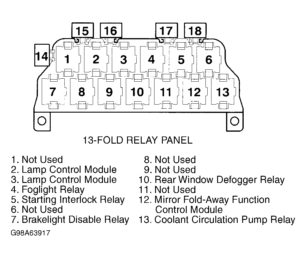 | Mirror Fold-Away Function Control Module | On 13-fold relay panel. See Figure . |