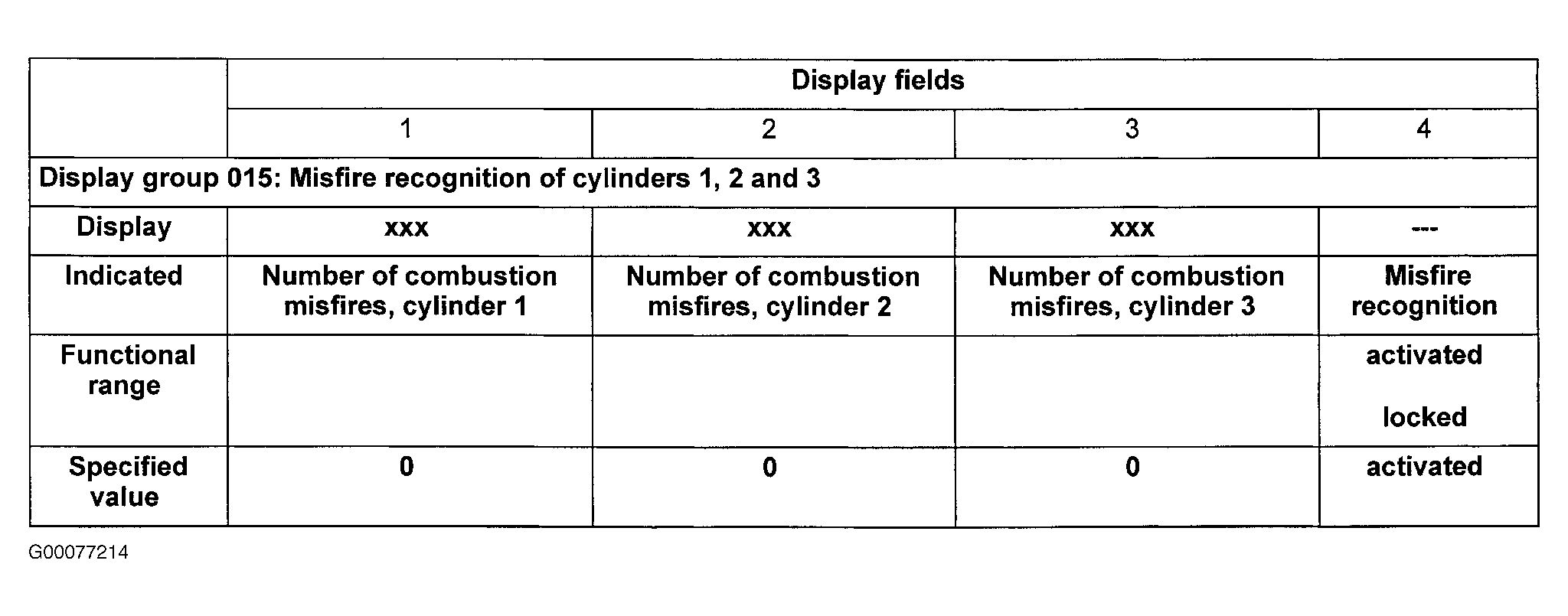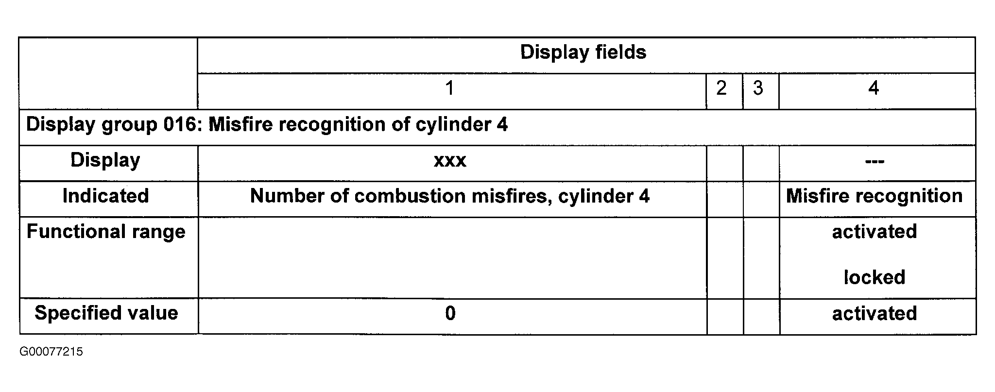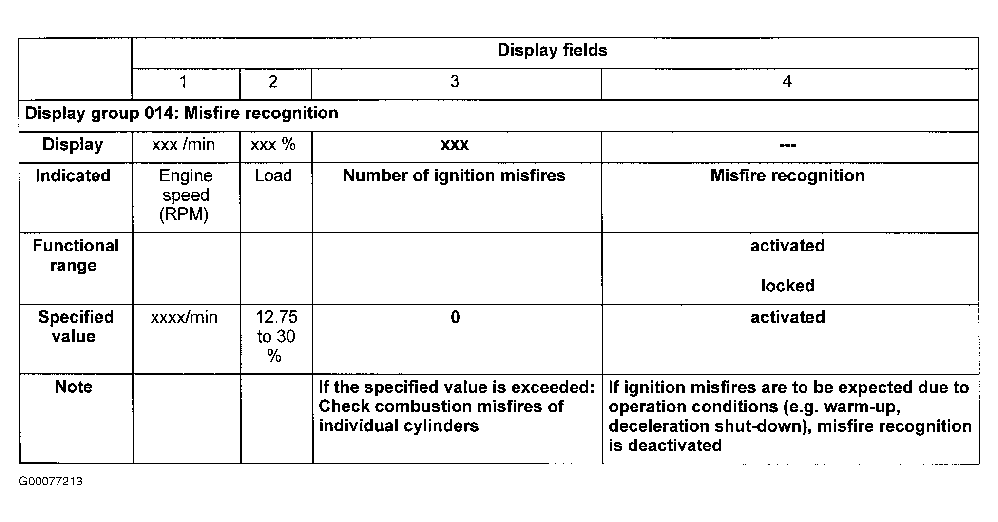 - On scan tool observe misfire recognition in display fields No. 3 and 4. See Fig 1