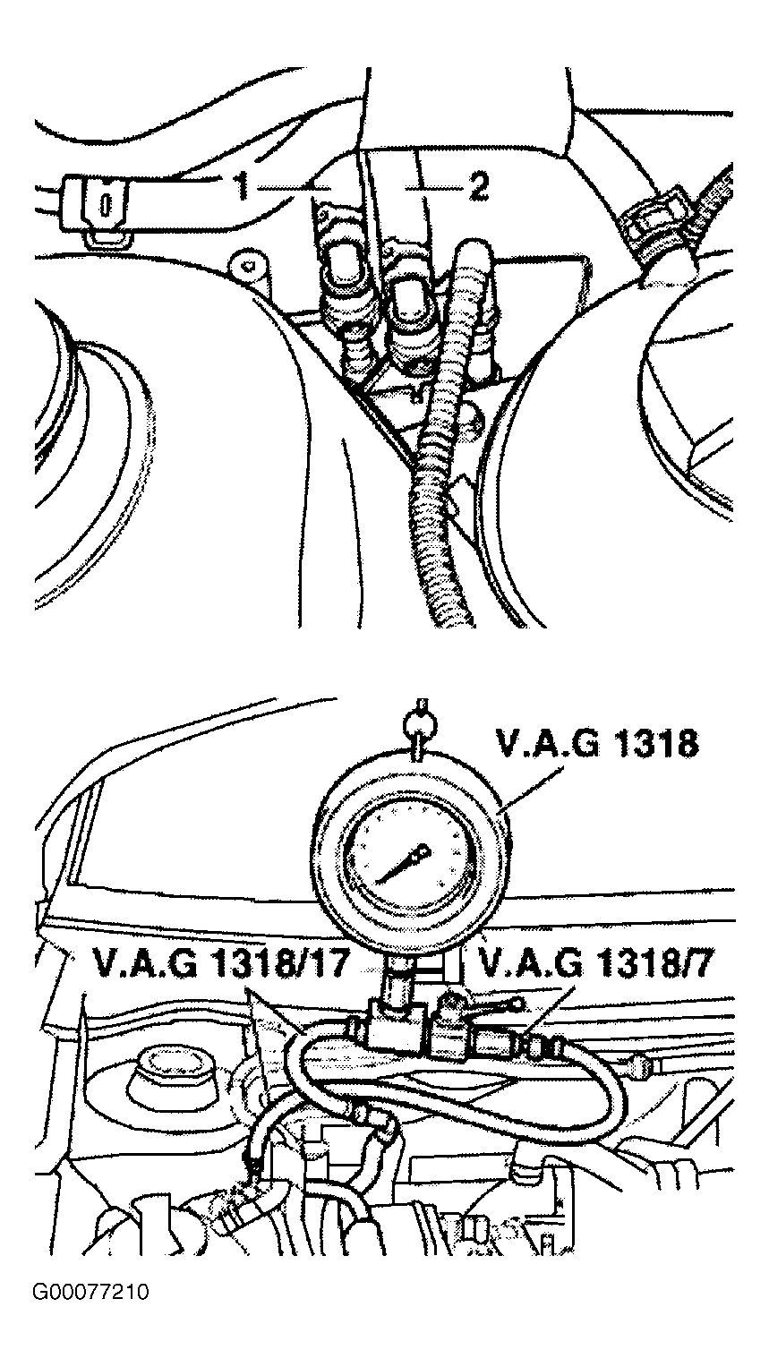 - Connect Pressure Gauge (VAG 1318) between fuel supply and fuel return lines in engine compartment. See Fig 3