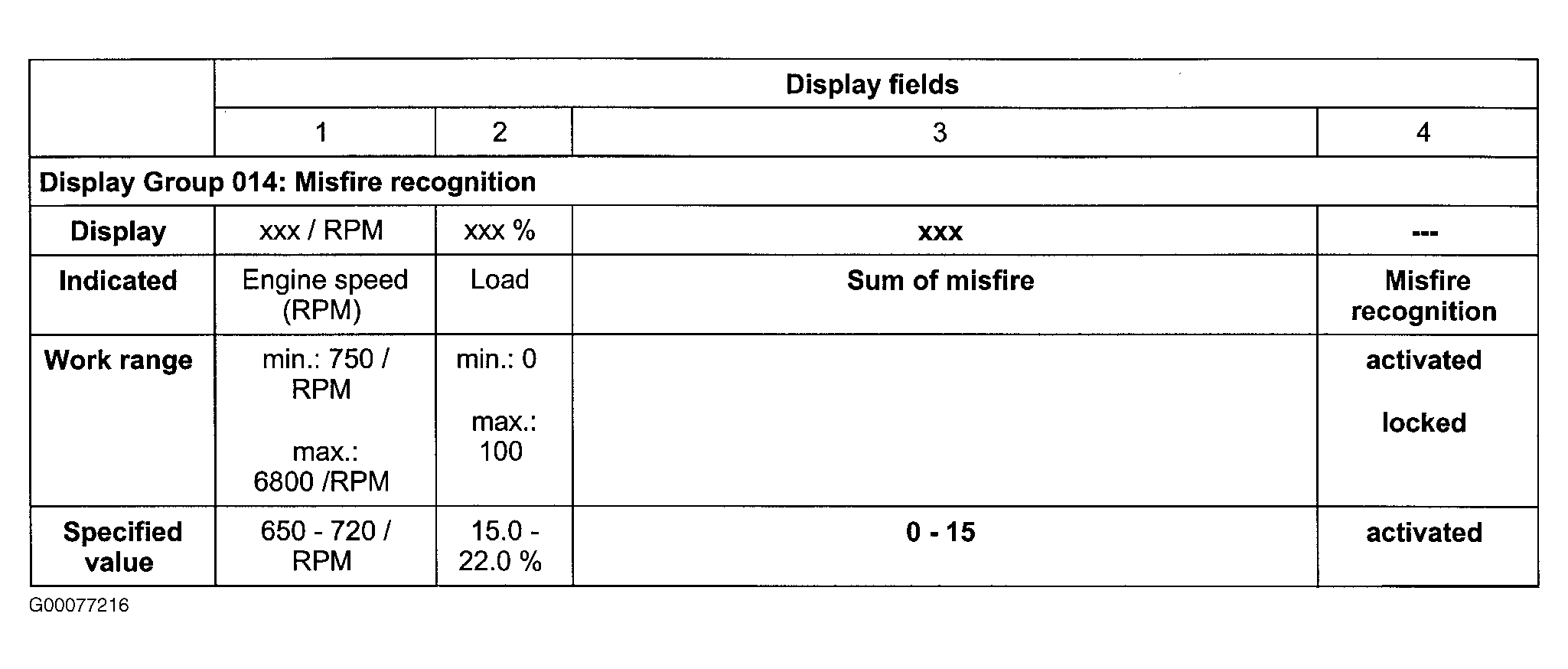 - On scan tool, press "014" to select DISPLAY GROUP 014. Observe misfire recognition in display field No. 3. See Fig 1