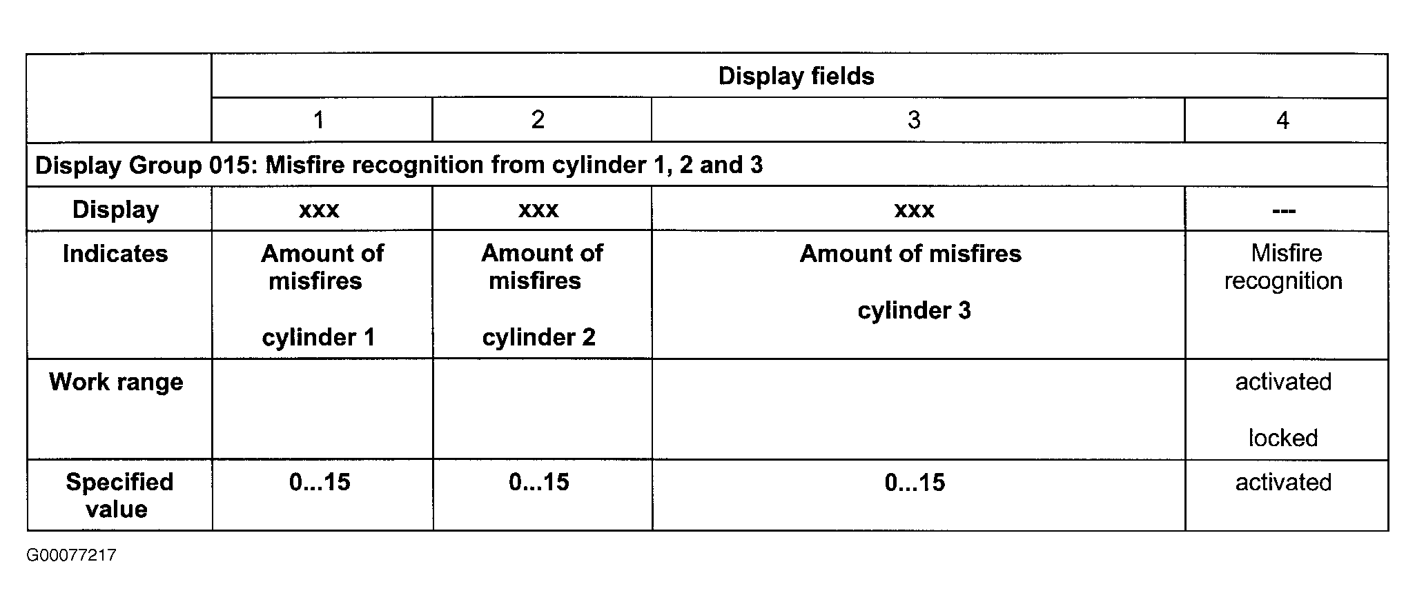 - On scan tool press "FORWARD ARROW" or enter "015" to select DISPLAY GROUP 015. Observe misfire recognition in display fields No. 1, 2 and 3. See Fig 2