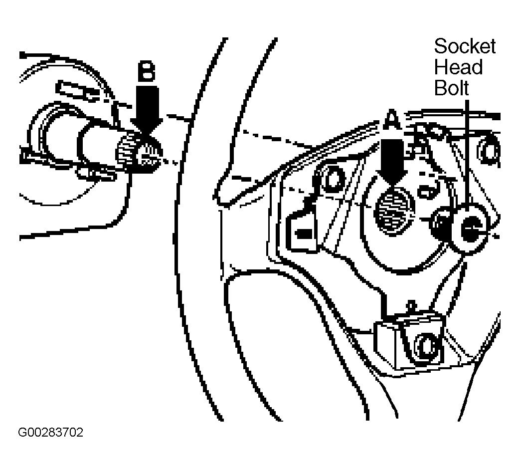 Arrow A is the line marking on steering wheel. Arrow B is the punch indentation on steering column. Otherwise centering of toothed shaft cannot be guaranteed. Steering columns that are delivered as replacement parts do not have punch indentations. Tightening torque of steering wheel socket head bolt (M12) is 41 ft. lbs. (55 N.m). Reapply markings after replacing steering column or steering wheel and performing alignment and road test.