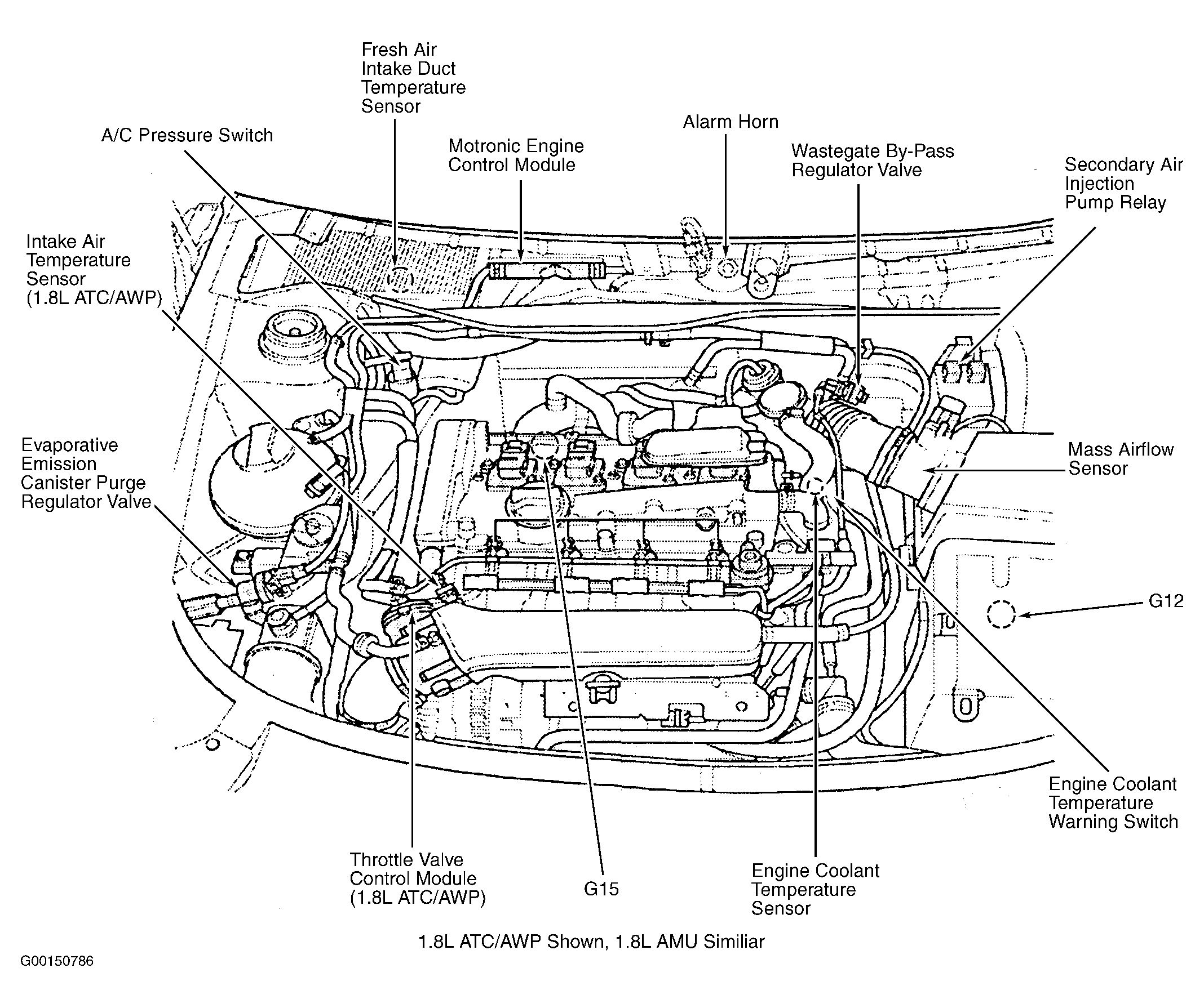 | Throttle Valve Control Module (1.8L AMU) | On throttle body, on left rear of engine. |