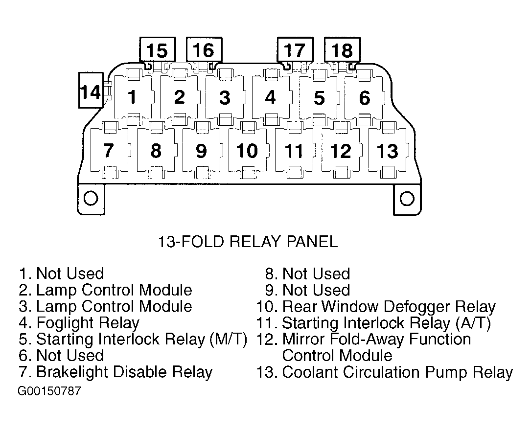 | Mirror Fold-Away Function Control Module | On 13-fold relay panel. See Figure . |