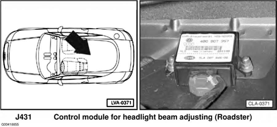 | Headlight Beam Adjusting Control Module (Roadster) | On bulkhead behind seats. See Figure . |