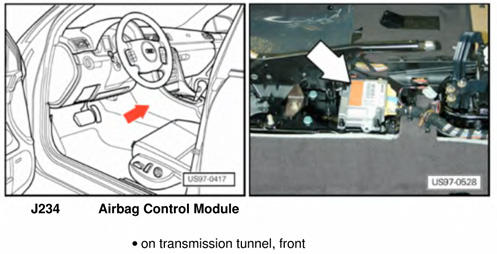 | Airbag Control Module | Under front of center console. See Figure. |