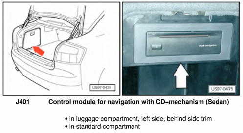 | Navigation Control Module W/CD | Left side of luggage compartment. See Figure. |